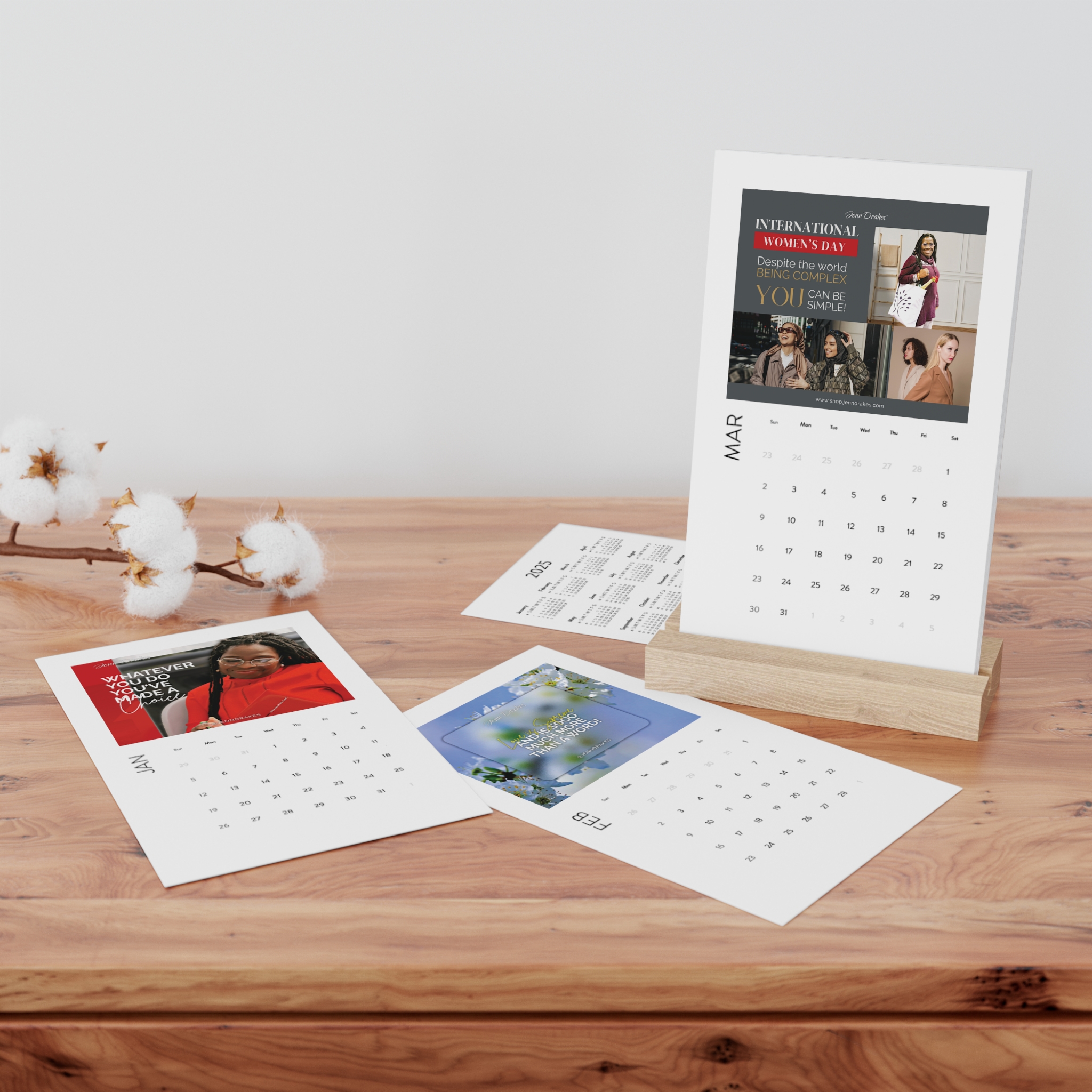 This vertical desk calendar is made of 100% paper. It comes in a stylish bright white, matte finish and a beautiful oak wood stand to keep your memories fresh on your desk.
